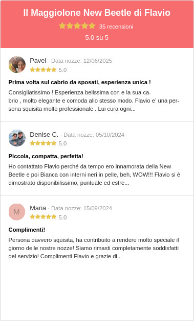 Benissimo, ora che mi conosci un po’ meglio, guarda cosa pensano gli sposi che hanno già dato fiducia a me e al mio Maggiolone: